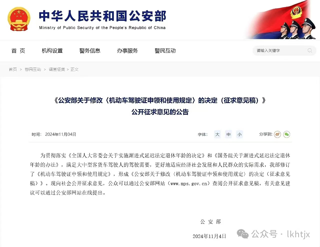 近日,公安部发布了关于修改《机动车驾驶证申领和使用规定〉的决定(征求意见稿)》公开征求意见的公告,其中指出自2025年1月1日起,大中型客货车准驾车型的年龄上限由60周岁延长至63周岁!